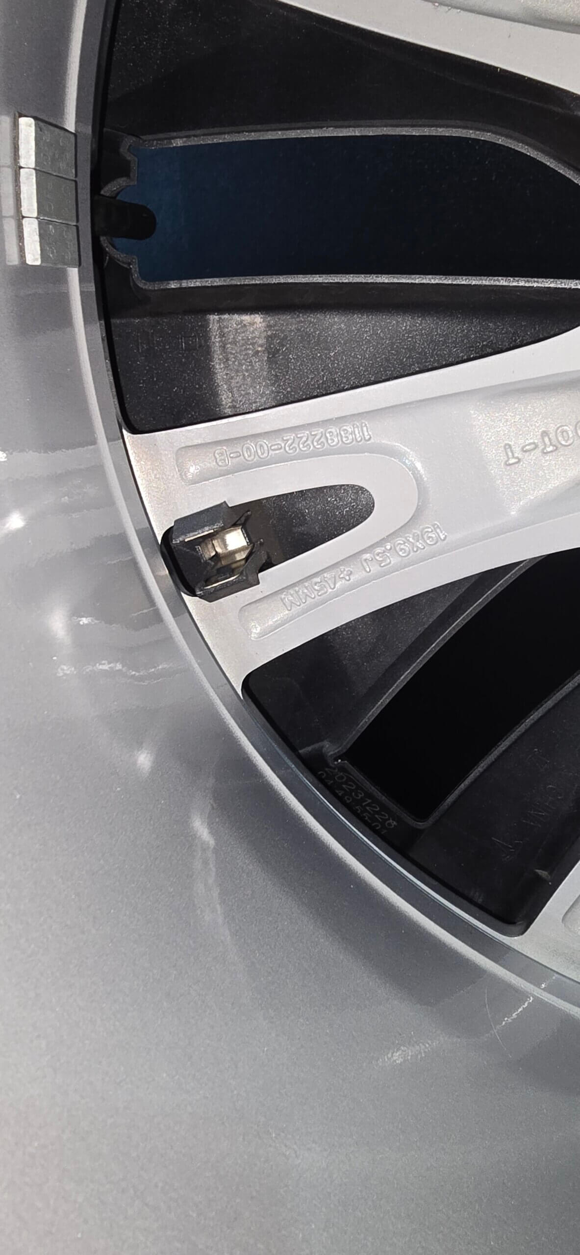 • Wheels: OEM 19×9.5 with a +45p offset – sleek, black wheel covers with silver alloy finish.